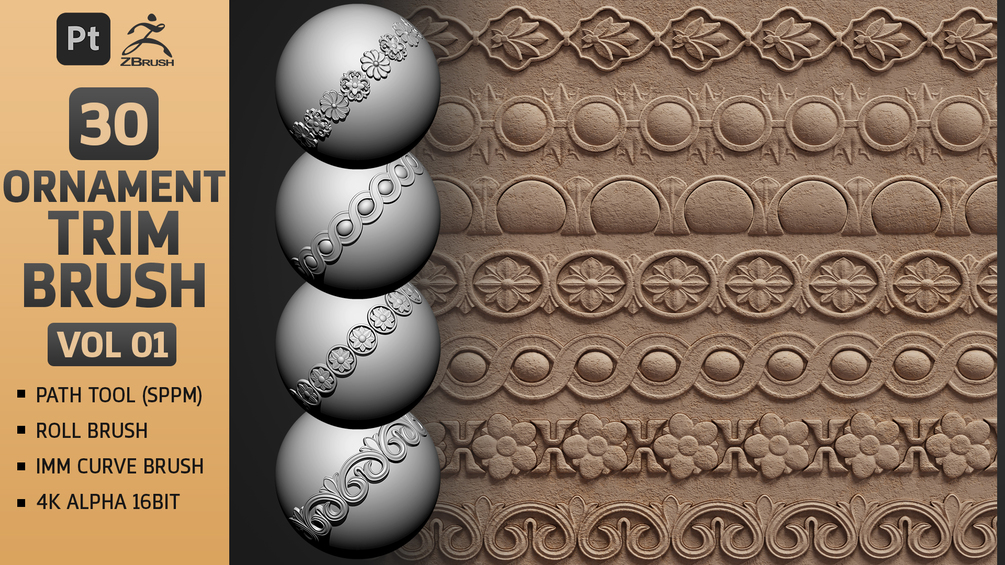 ⚜️⚜️ 30 Ornament Trim Brush (Path Tool,Zbrush Roll Brush,4K Seamless Alpha 16Bit) - VOL 01 ⚜️⚜️