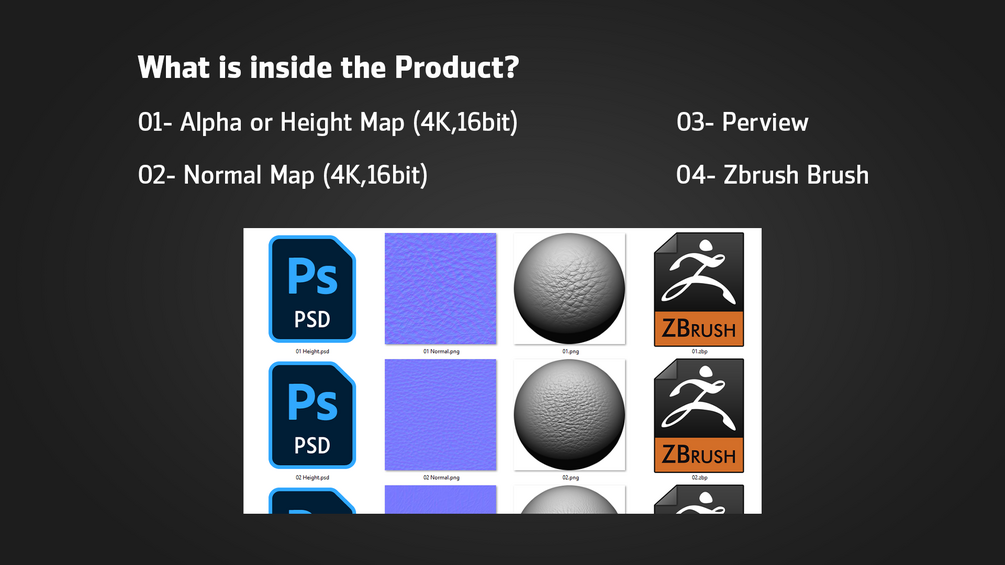 30 Seamless 4K Alpha - 30 Seamless 4K Normal Maps - 30 ZBrush Brushes - 30 Preview Images