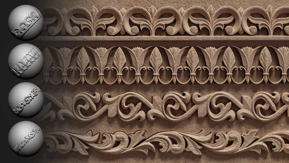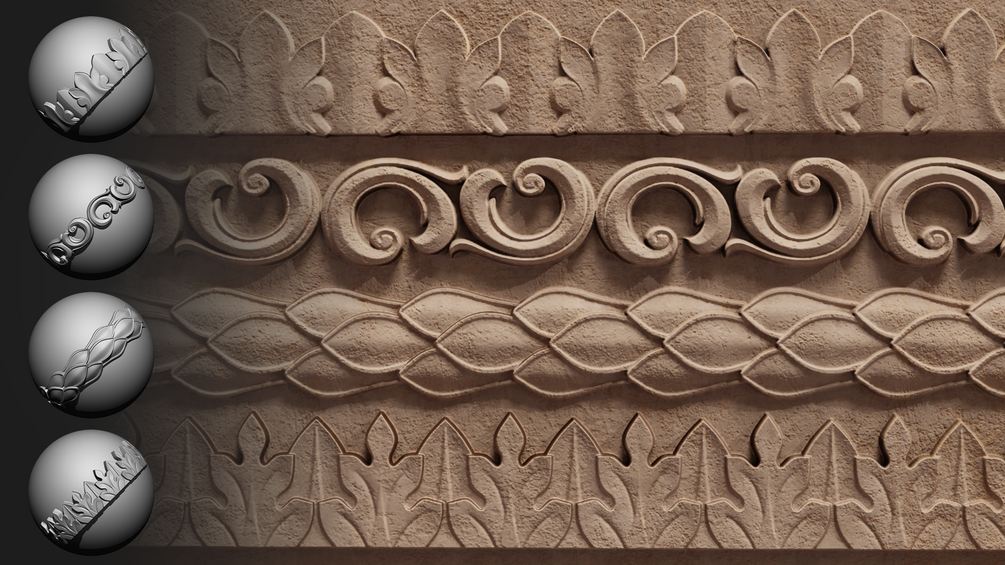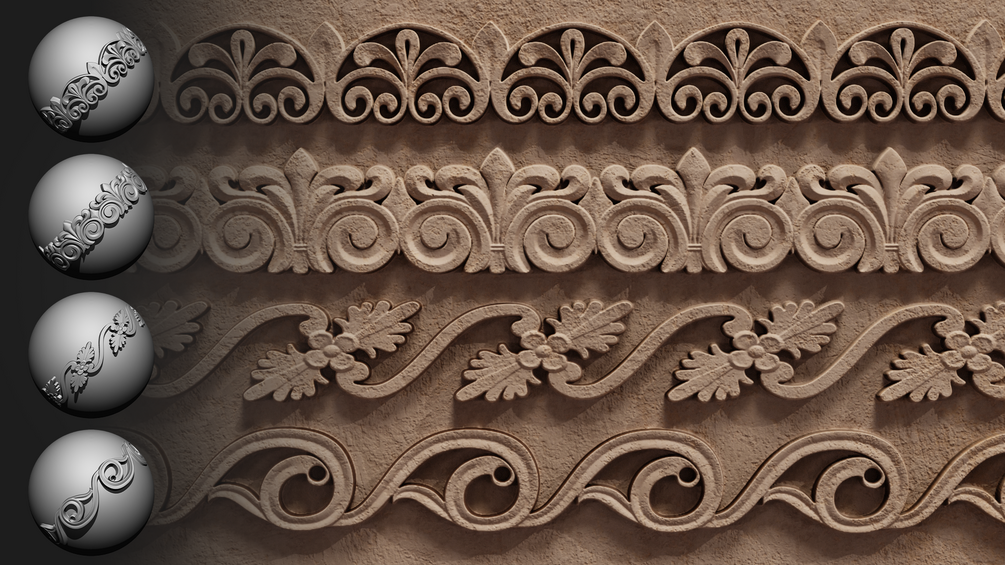 • 30 Roll Brushes for ZBrush – Sculpt ornament trims easily and precisely.