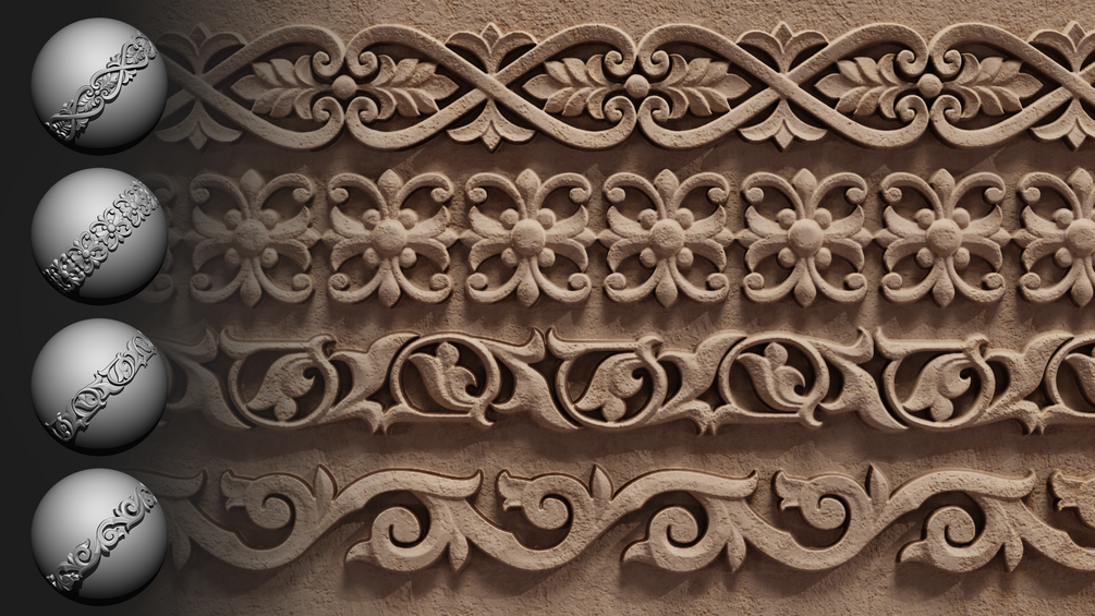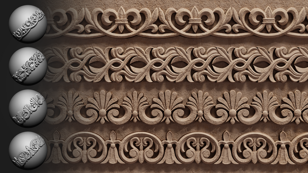 • 30 4K Seamless Alphas (16-bit, PSD) – High-definition ornament alphas for detailed surface texture.